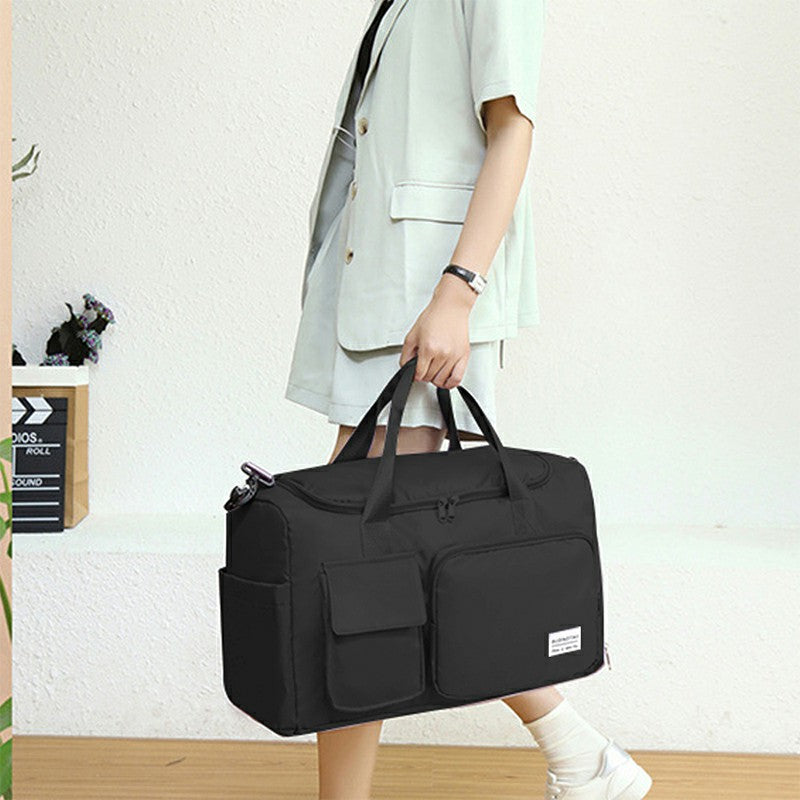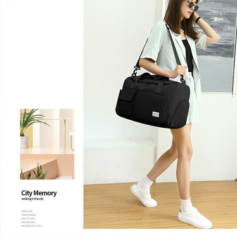 - The womens gym bag features multi-pocket design—1 spacious main pocket, 1 shoe compartment, 3 exterior pocket and a wet pocket for wet clothes, toiletries or towels?keeping all your essentials well organized.